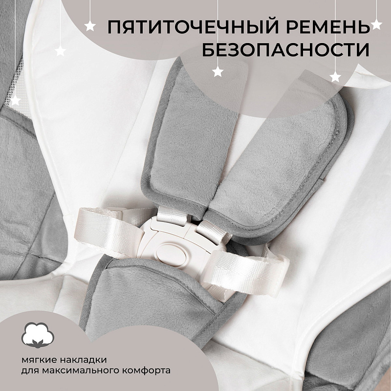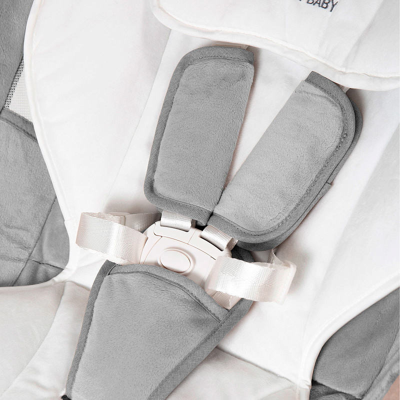 - Пятиточечные ремни безопасности с мягкими плюшевыми накладками надежно зафиксируют малыша