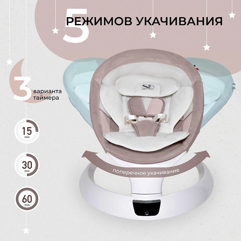 - 3 режима таймера укачивания на 15, 30, 60 минут помогут запланировать режим работы электрокачель.