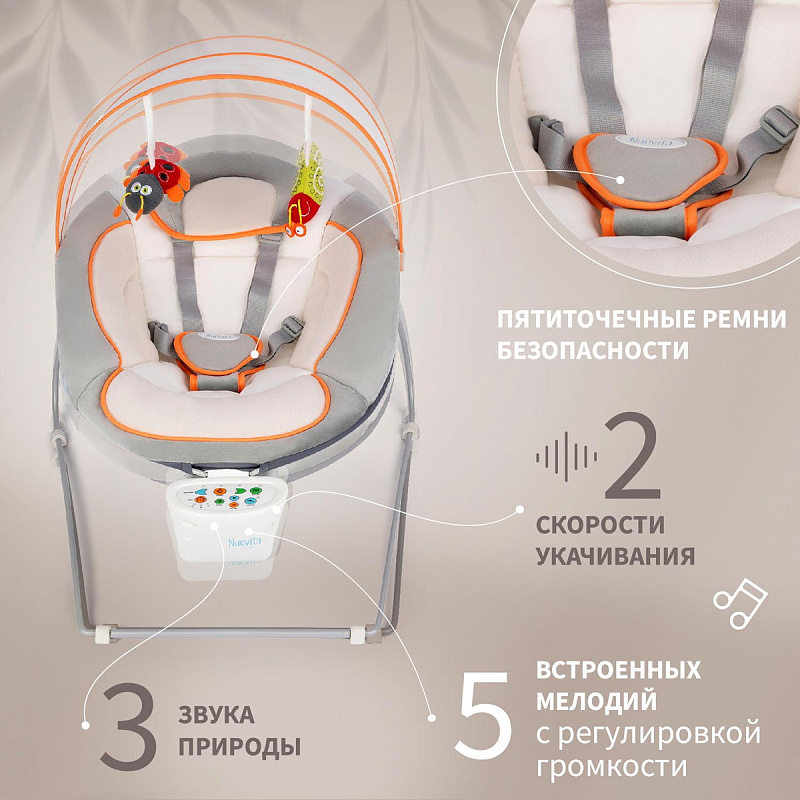 Купить электрокачель Nuovita Cullare, отзывы о которой, говорят о том, что изделие отмечается отменным качеством и привлекательным внешним видом. Дуга с игрушками, приятные мелодии и звуки природы, две скорости качания - все это позволит ребенку интересно проводить время и познавать окружающий мир.