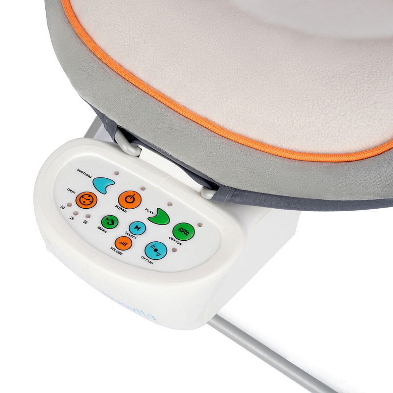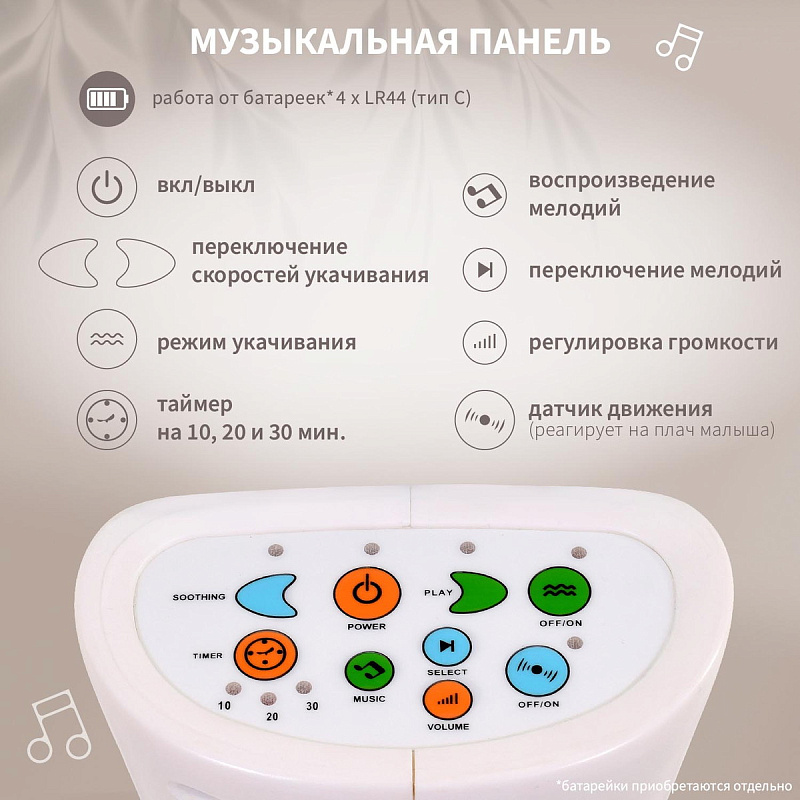 - Качель удобна в управлении. Оснащена таймером. Может работать, как от сети, так и от батареек.