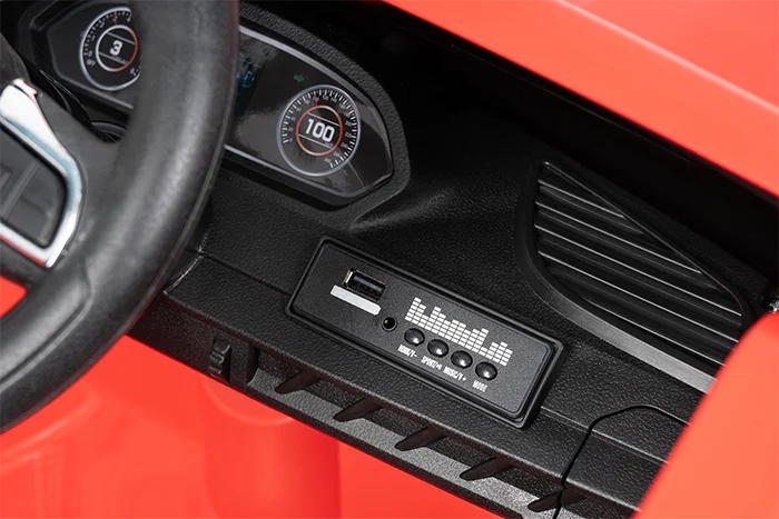 Встроена приборная панель как в настоящем авто: звук запуска двигателя, загораются фары, есть возможность подключить любимую музыку через разъемы для USB и Bluetooth.