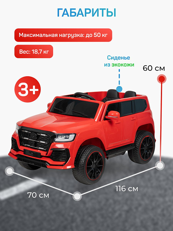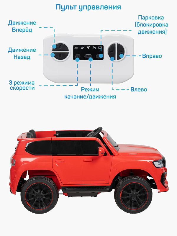 Мягкое одноместное сиденье из качественной экокожи, оборудовано ремнем безопасности. Колеса из материала EVA не боятся проколов и не нуждаются в подкачке. Электромобиль имеет хорошее сцепление с дорожным покрытием.