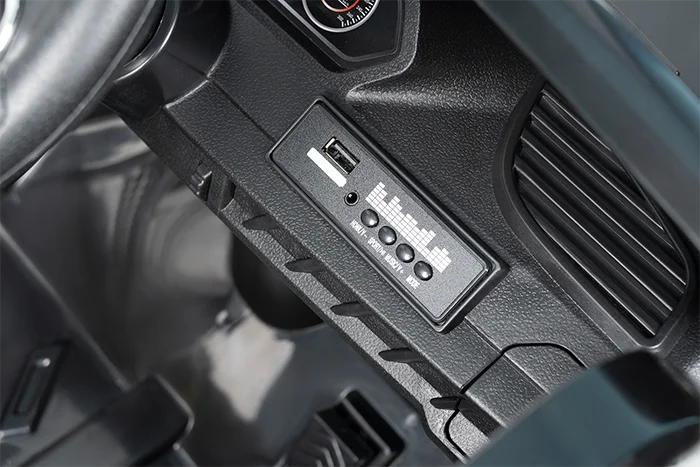 Встроена приборная панель как в настоящем авто: звук запуска двигателя, загораются фары, есть возможность подключить любимую музыку через разъемы для USB и Bluetooth.
