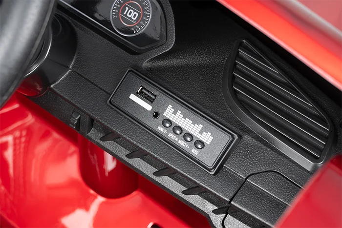 Встроена приборная панель как в настоящем авто: звук запуска двигателя, загораются фары, есть возможность подключить любимую музыку через разъемы для USB и Bluetooth.