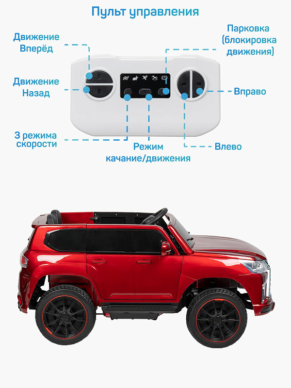 Управление за счет педали газа, машина едет вперед и назад, а также встроена функция качания. С помощью пульта дистанционного управления родители могут не беспокоится о безопасности ребенка и самостоятельно управлять машинкой.