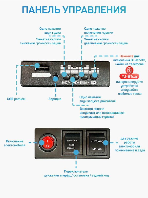 Встроена приборная панель как в настоящем авто: звук запуска двигателя, загораются фары, есть возможность подключить любимую музыку через разъемы для USB и Bluetooth.