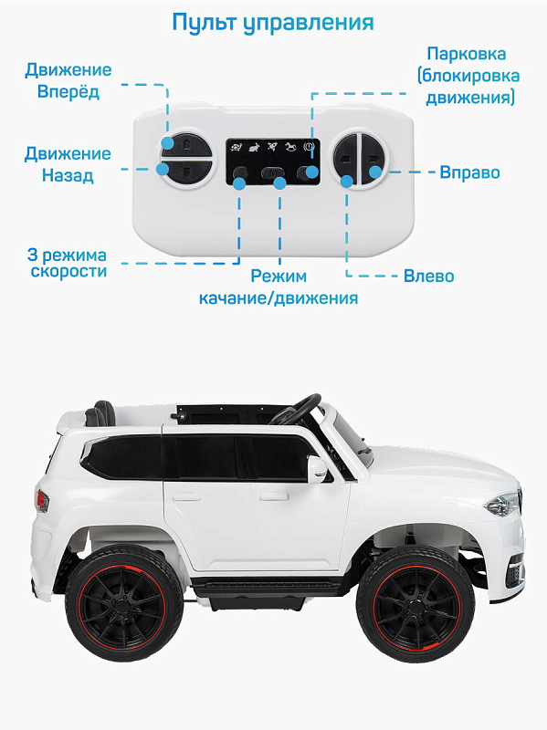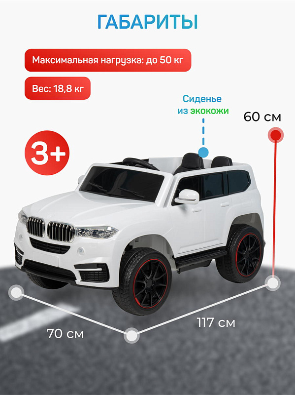 Мягкое одноместное сиденье из качественной экокожи, оборудовано ремнем безопасности. Колеса из материала EVA не боятся проколов и не нуждаются в подкачке. Электромобиль имеет хорошее сцепление с дорожным покрытием.