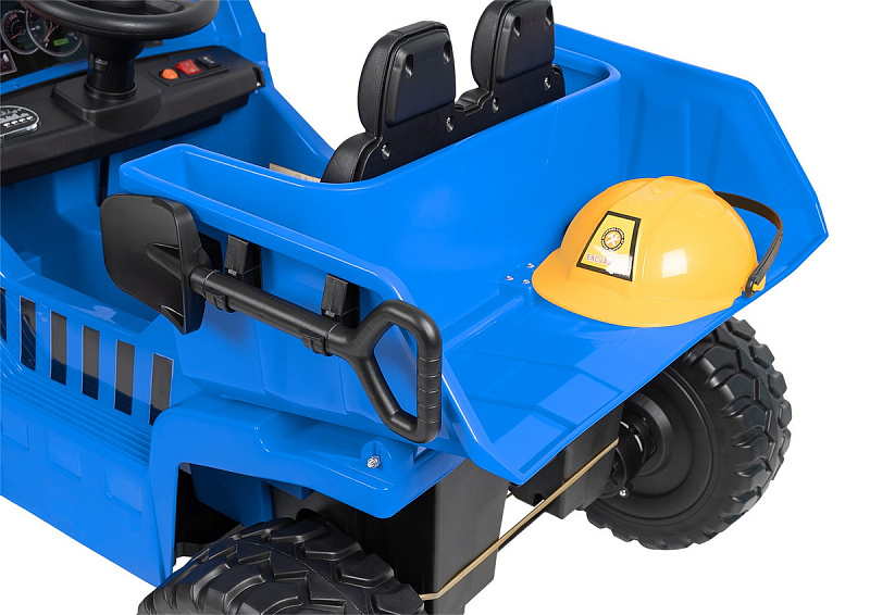 Реалистичный дизайн и функции: электромобиль выглядит как настоящий самосвал, оснащён откидным кузовом, лопаткой, каской и рацией.