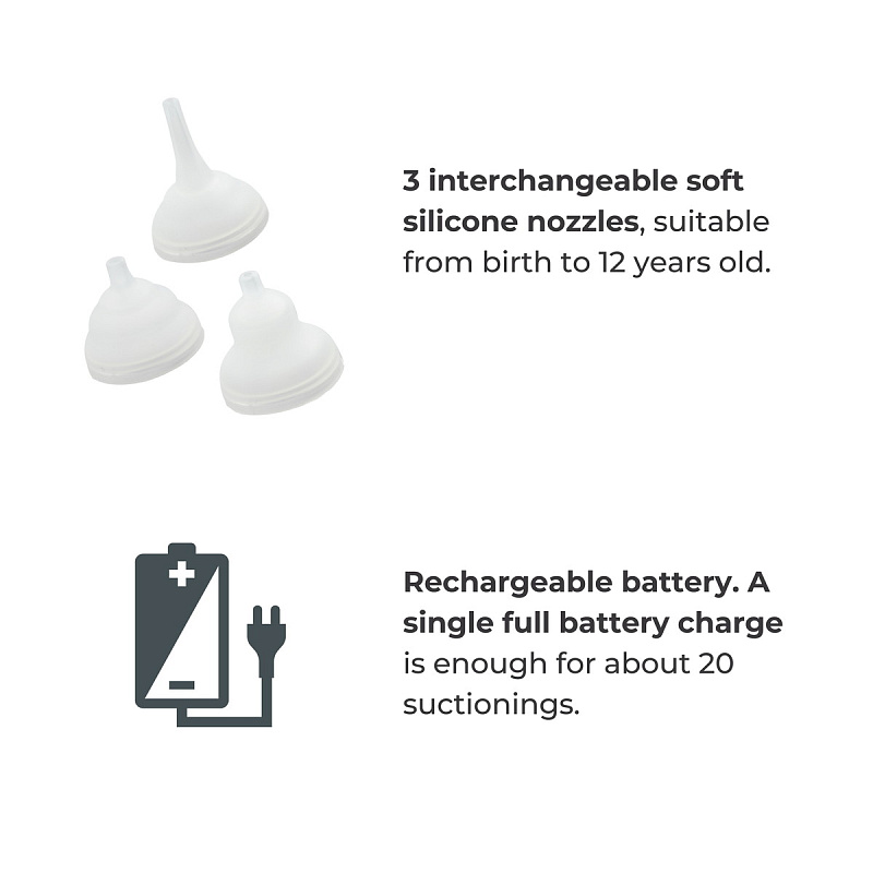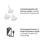 - 3 сменные мягкие силиконовые насадки, которые используются для отсасывания густой, поверхностной или глубокой слизи.