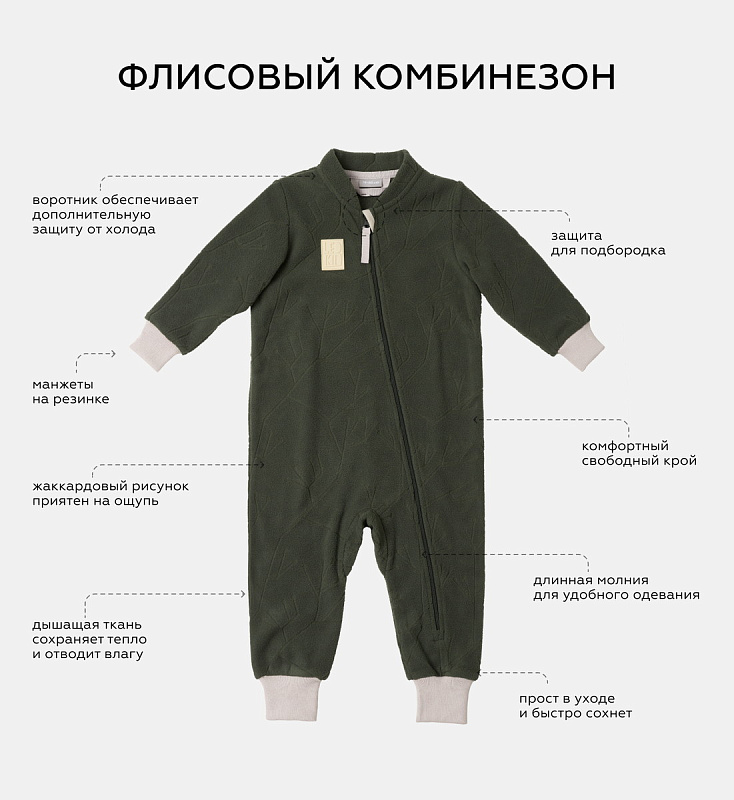 Технологичный материал комбинезона прост в уходе, позволяет коже дышать, сохраняет тепло, поддерживает комфортную температуру тела, а также даже в намокшем состоянии эффективно отводит влагу и быстро сохнет.