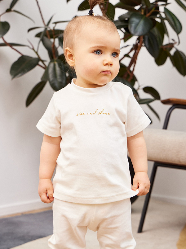 Для отпуска или теплых летних дней крохе обязательно пригодятся футболки. Очаровательные модели с кнопочками рядом с горловиной удобно как снимать, так и надевать.