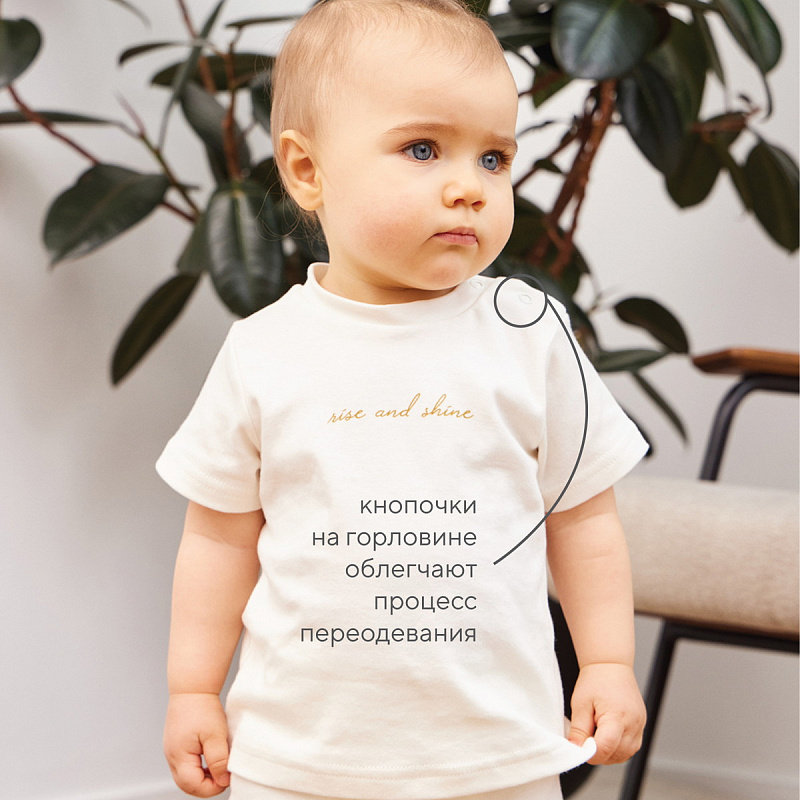 Для отпуска или теплых летних дней крохе обязательно пригодятся футболки. Очаровательные модели с кнопочками рядом с горловиной удобно как снимать, так и надевать.