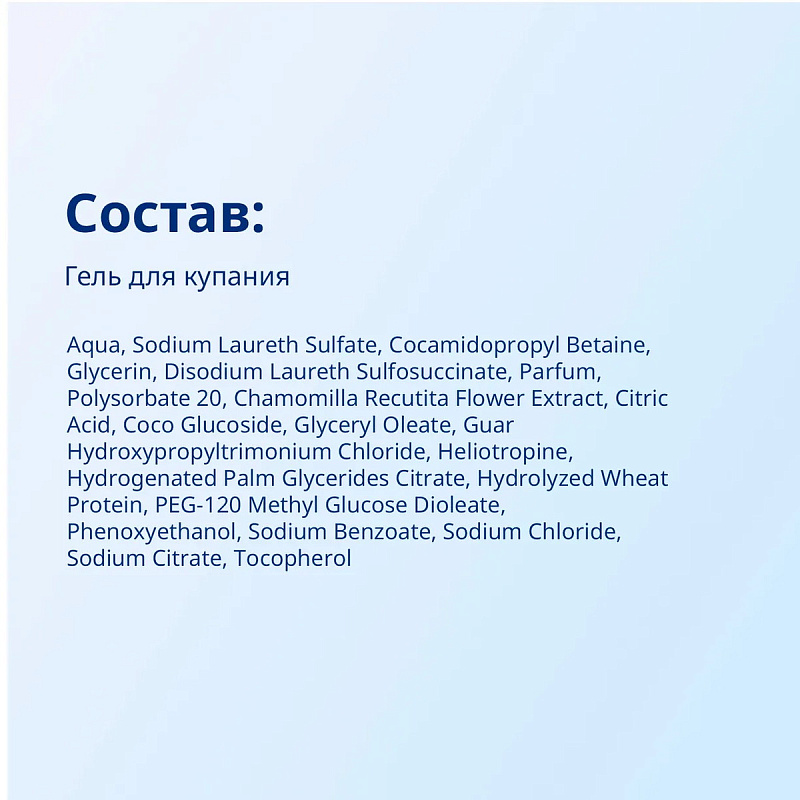Aqua, Sodium Laureth Sulfate, Cocamidopropyl Betaine, Glycerin, Disodium Laureth Sulfosuccinate, Parfum, Polysorbate 20, Chamomilla Recutita Flower Extract, Citric Acid, Coco Glucoside, Glyceryl Oleate, Guar Hydroxypropyltrimonium Chloride, Heliotropine, Hydrogenated Palm Glycerides Citrate, Hydrolyzed Wheat Protein, PEG-120 Methyl Glucose Dioleate, Phenoxyethanol, Sodium Benzoate, Sodium Chloride, Sodium Citrate, Tocopherol