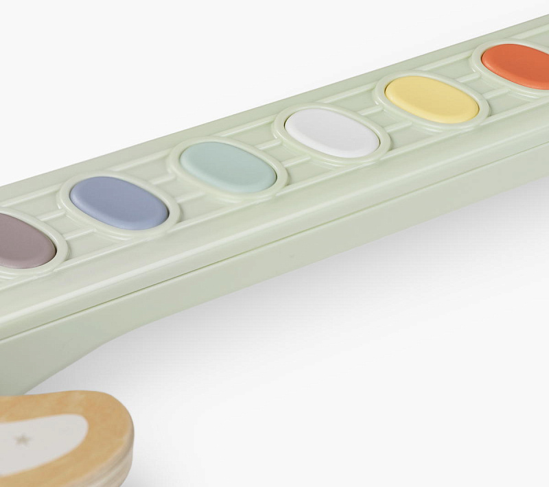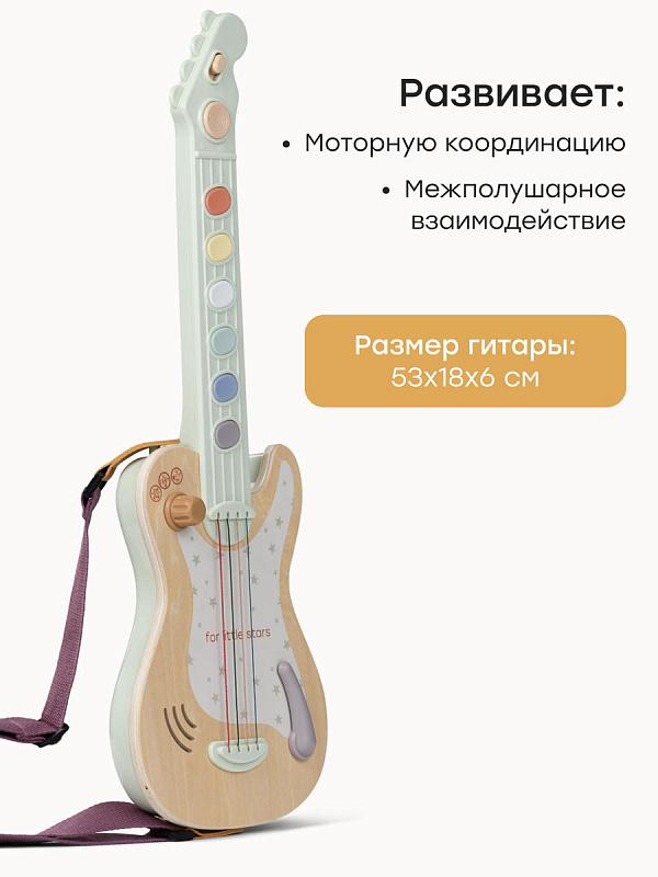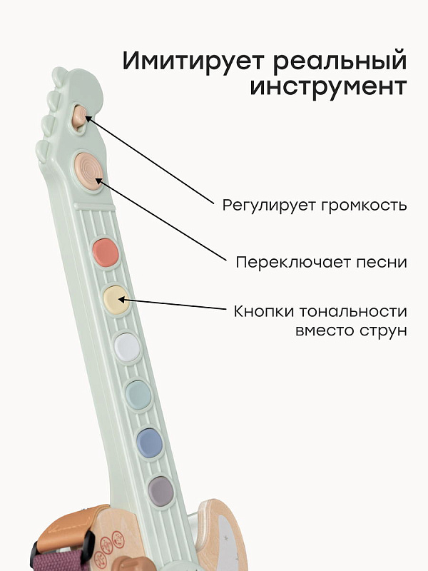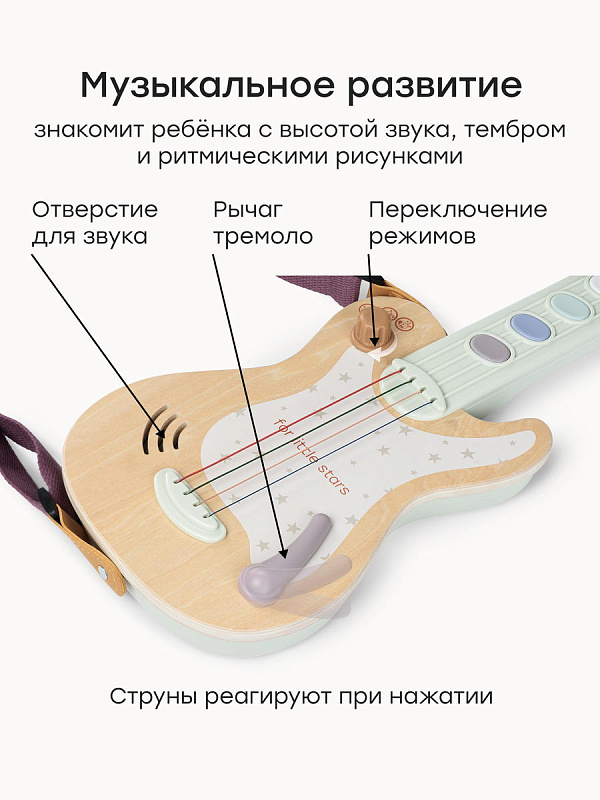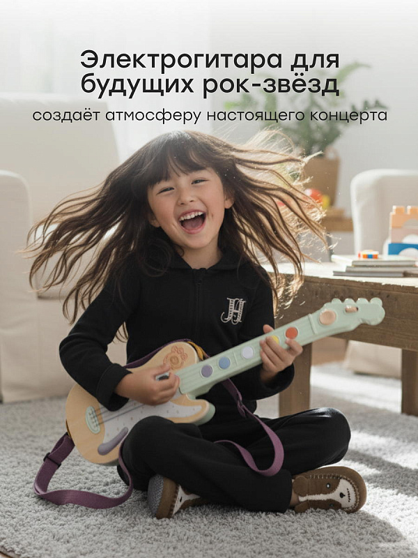 Развитие навыков - взаимодействие со струнами и кнопками помогает ребёнку тренировать координацию движений, внимание и мелкую моторику. Игрушка работает как полноценная развивающая музыкальная гитара для детей.