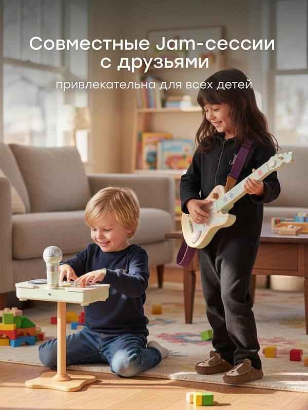 Совместная игра - такая гитара игрушка детская со струнами подходит для домашних выступлений, игр в детском саду, музыкальных импровизаций и мини-концертов, развивая коммуникабельность и уверенность ребёнка: