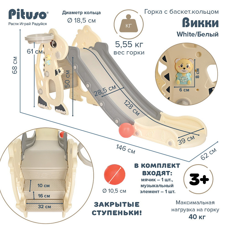 Детская Горка Pituso «Викки» YYS850 рассчитана на детей в возрасте от 3 до 10 лет. Она имеет яркий дизайн и оснащена баскетбольным кольцом, которое крепится к боковой панели, а также музыкальным элементом в форме мишки с веселыми мелодиями. На горку ведут закрытые нескользящие ступеньки.