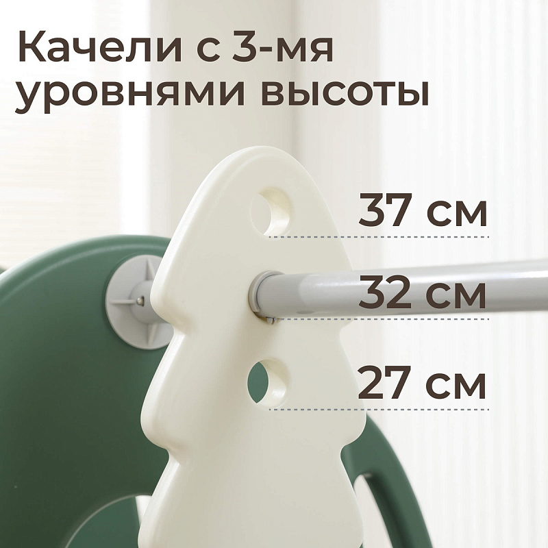 Особого внимания заслуживает оснащение качели и горки удобным механизмом регулировки высоты сиденья качелей с помощью надежных карабинов. Самостоятельно подобранная высота позволит адаптировать изделие под индивидуальные особенности каждого малыша. Качели оборудованы удобной и безопасной спинкой высотой 68 см, предотвращающей случайное выпадение, а размер посадочного места 26,5×36 см гарантирует комфортное размещение любого ребенка независимо от телосложения.