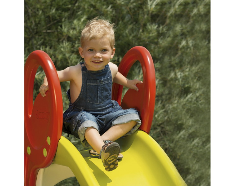 Горка оснащена удобными и большими ручками и нескользящими ступеньками.Также к горке можно подключить шланг с водой и устроить настоящий водный аттракцион. Идеально подходит для игры на даче