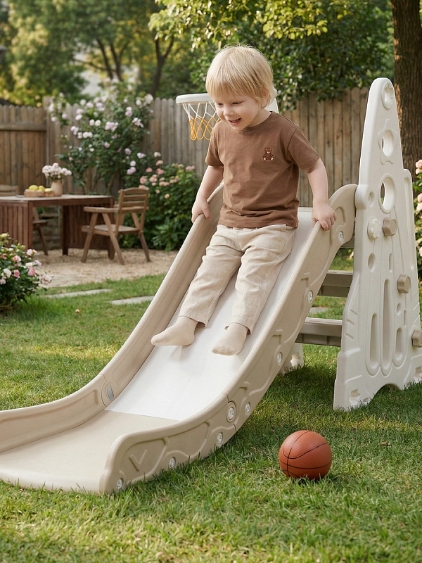 Но главная особенность — это дополнительная возможность играть в баскетбол! Малыш сможет освоить этот популярный вид спорта буквально с первых шагов. Вместе с кольцом поставляется резиновый мячик диаметром 15 см, идеального размера для детских рук. Ребенок получает не только удовольствие от скоростного спуска, но и развивает координацию движений, ловкость и физическую выносливость.
