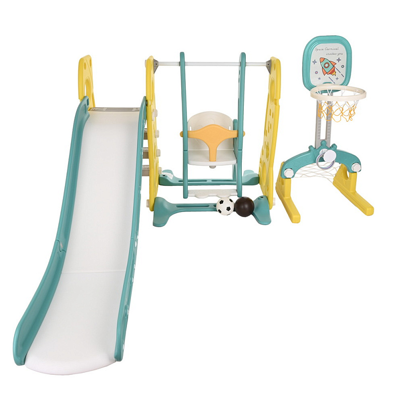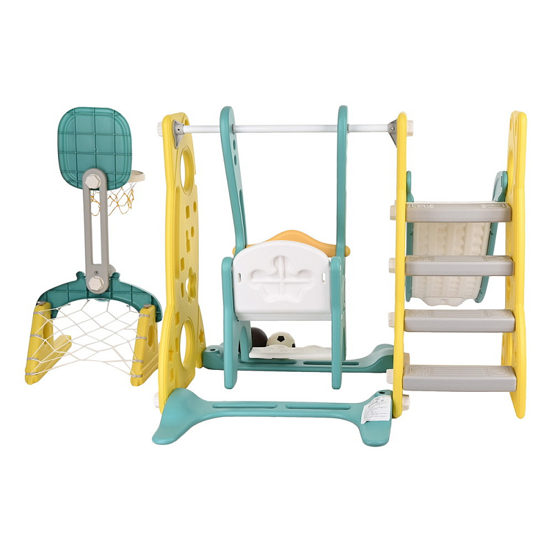 В наборепластиковая горка, качели, лесенка, кольцо баскетбольное (1 шт), ворота