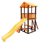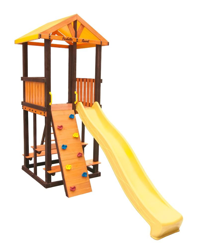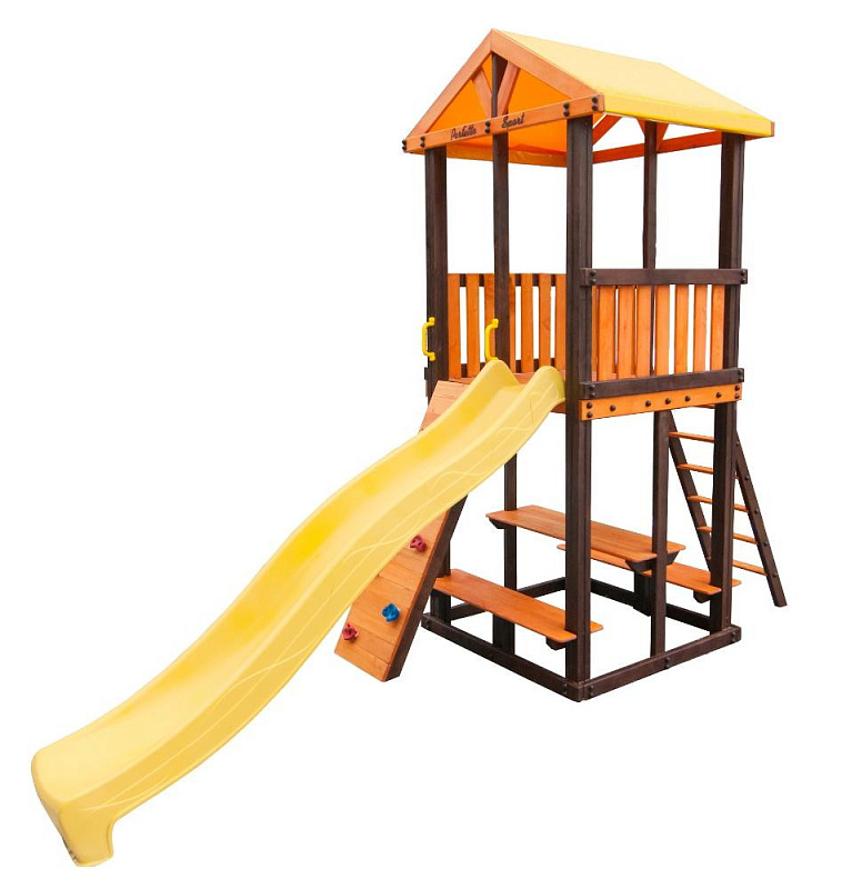 В набореигровой домик, столик, лавочка - 2 шт, лестница, скат, ручка пластиковая - 2 шт, скалодром маленький