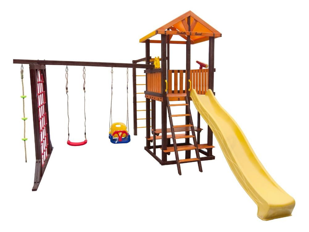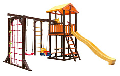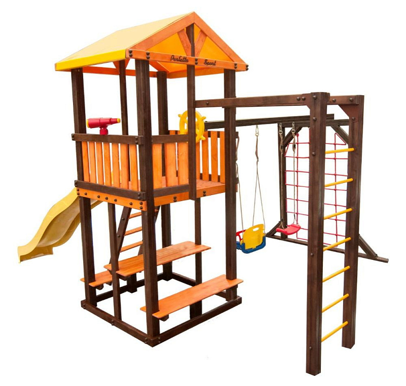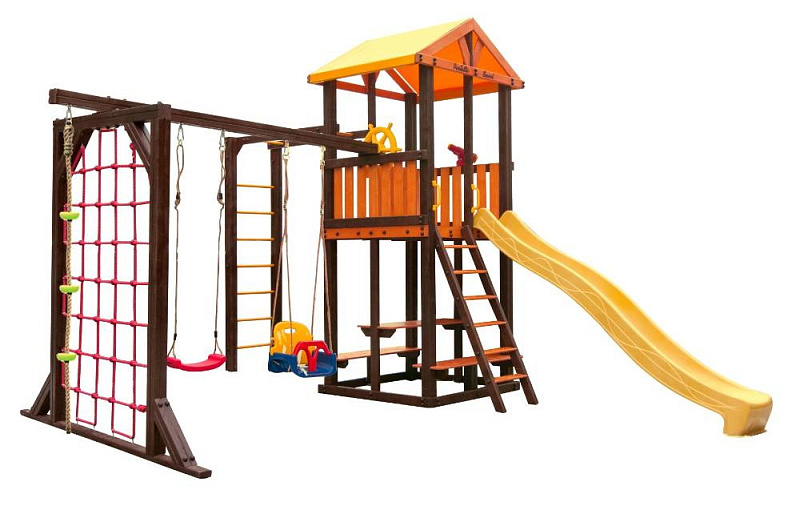 В набореигровой домик, столик, лавочка - 2 шт, лестница, скат, ручка пластиковая - 2 шт, Р-опция, П-опция, качели "Лодочка", качели "Малыш", канат с зацепами, штурвал "Шторм", бинокль "Капитан"