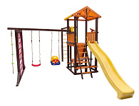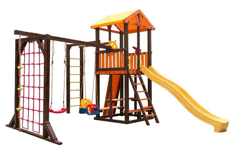 В набореигровой домик, столик, лавочка - 2 шт, лестница, скат, ручка пластиковая - 2 шт, Р-опция, П-опция, качели "Лодочка", качели "Малыш", канат с зацепами, штурвал "Шторм", бинокль "Капитан", скалодром маленький