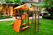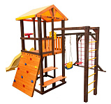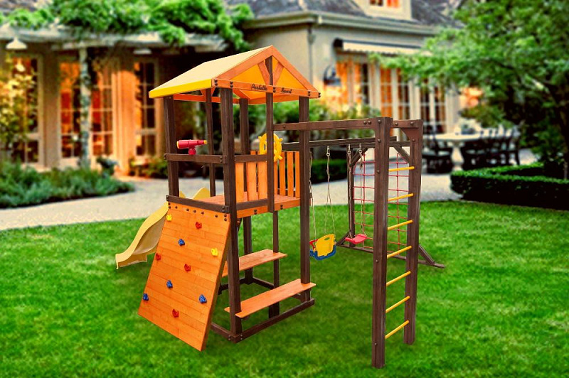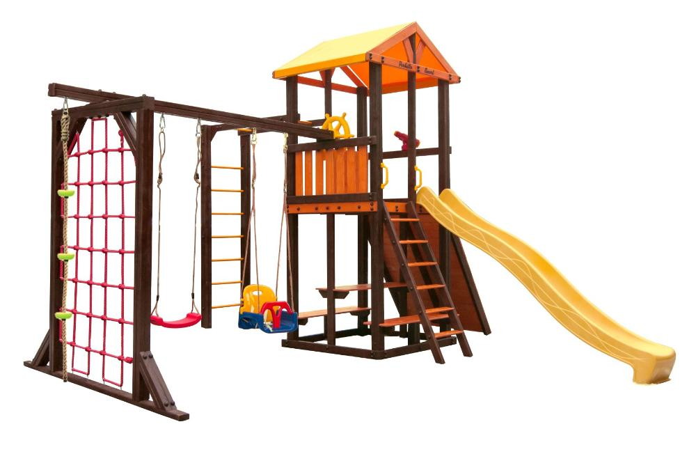 В набореигровой домик, столик, лавочка - 2 шт, лестница, скат, ручка пластиковая - 2 шт, Р-опция, П-опция, качели "Лодочка", качели "Малыш", канат с зацепами, штурвал "Шторм", бинокль "Капитан", скалодром большой