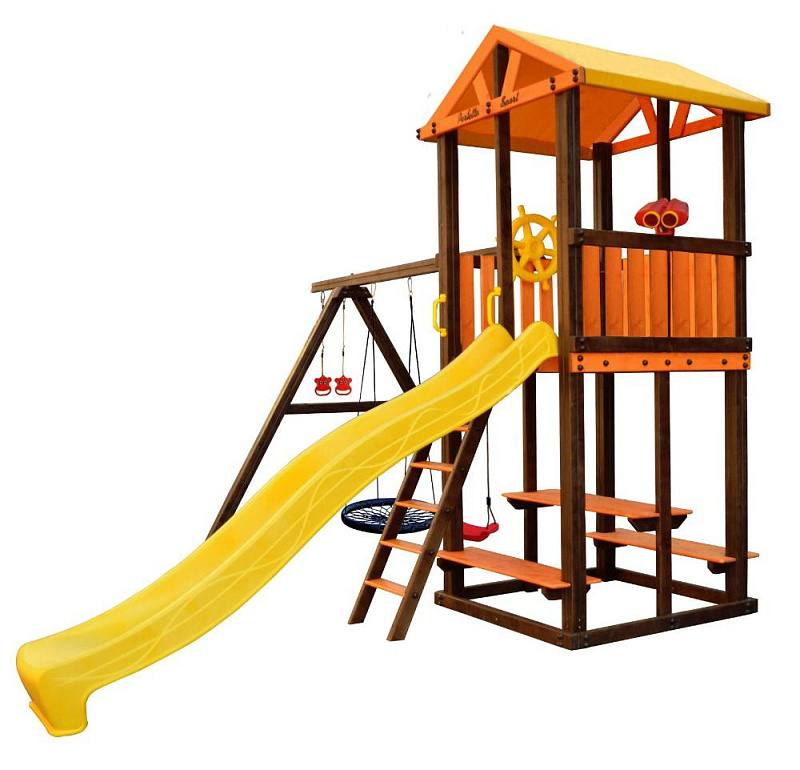 В набореигровой домик, столик, лавочка - 2 шт, лестница, скат, ручка пластиковая - 2 шт, А-опция, качели "Лодочка" 2 шт, кольца "Микки", штурвал "Шторм", бинокль "Капитан", качели "Паутина"