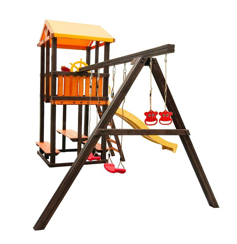 В набореигровой домик, столик, лавочка - 2 шт, лестница, скат, ручка пластиковая - 2 шт, А-опция, качели "Лодочка" 2 шт, кольца "Микки", штурвал "Шторм", бинокль "Капитан"