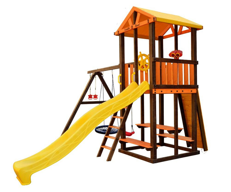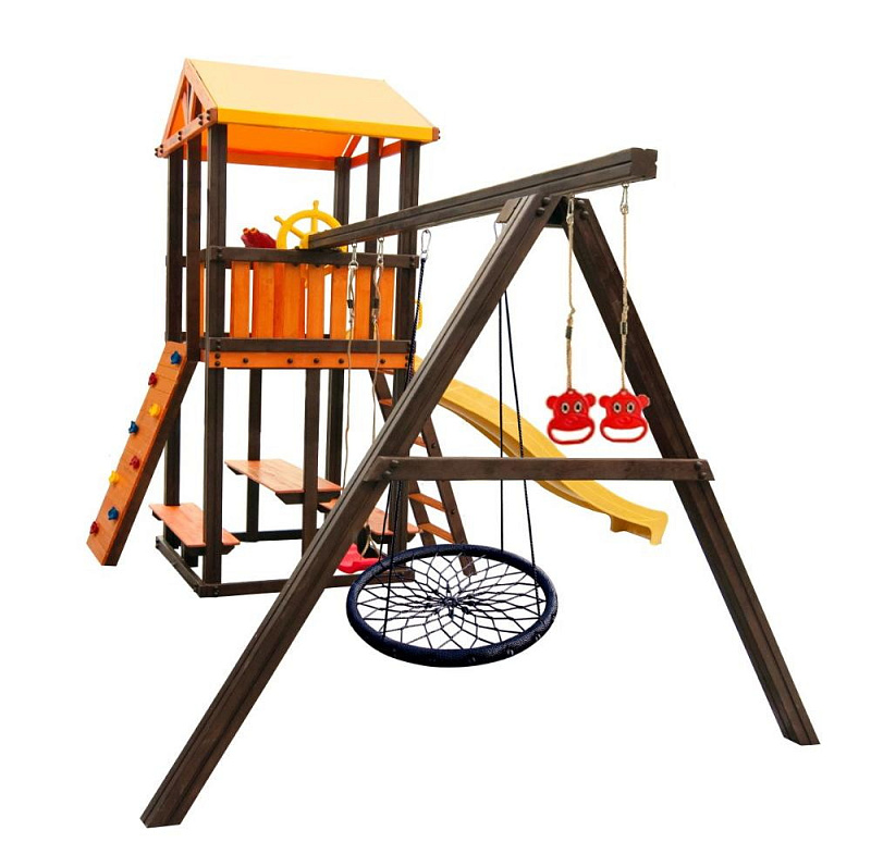 В набореигровой домик, столик, лавочка - 2 шт, лестница, скат, ручка пластиковая - 2 шт, А-опция, качели "Лодочка" 2 шт, кольца "Микки", штурвал "Шторм", бинокль "Капитан", скалодром маленький, качели "Паутина"