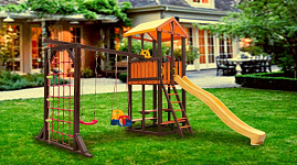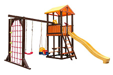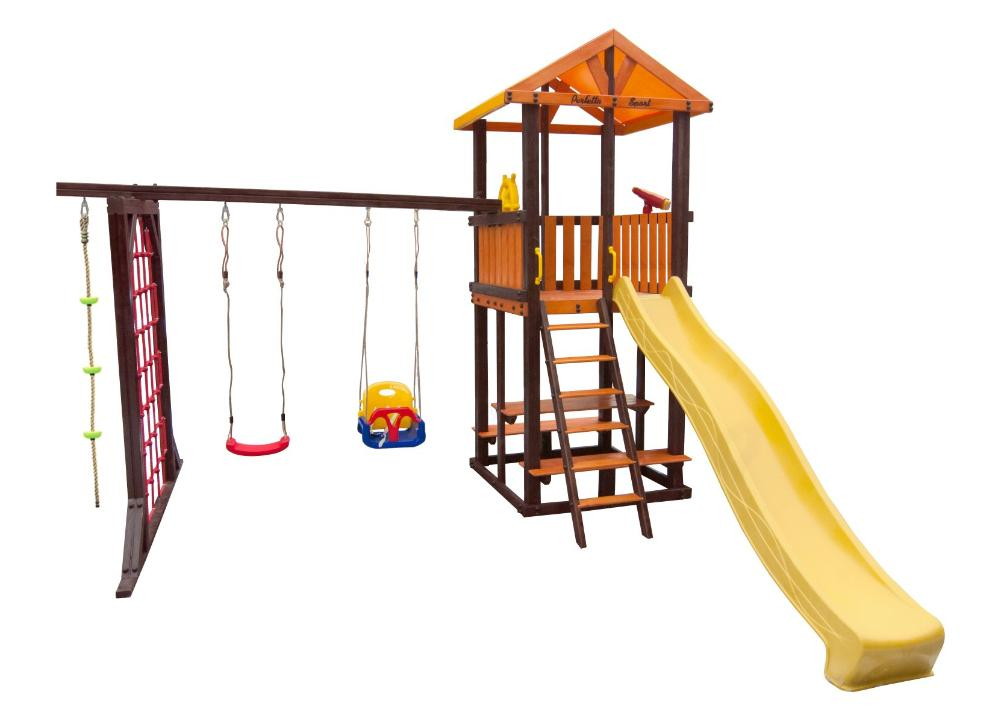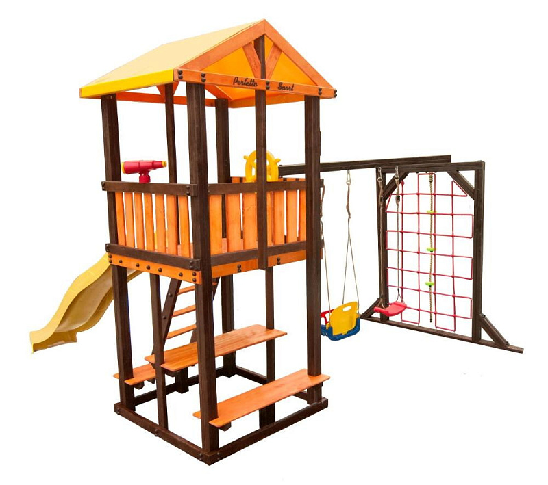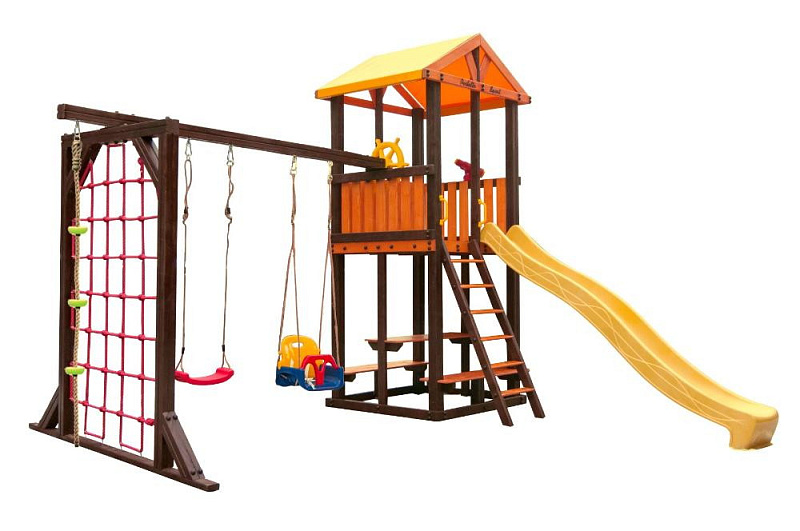 В набореигровой домик, столик, лавочка - 2 шт, лестница, скат, ручка пластиковая - 2 шт, П-опция, качели "Лодочка", качели "Малыш", канат с зацепами, штурвал "Шторм", бинокль "Капитан"