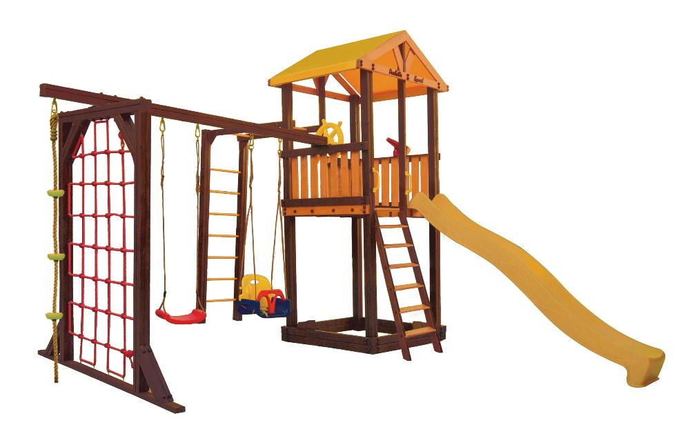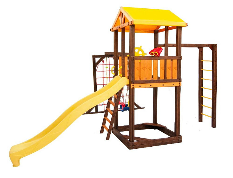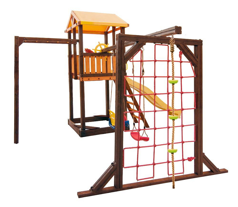 В набореигровой домик, песочница, лестница, скат, ручка пластиковая - 2 шт, Р-опция, П-опция, качели "Лодочка", качели "Малыш", канат с зацепами, штурвал "Шторм", бинокль "Капитан"
