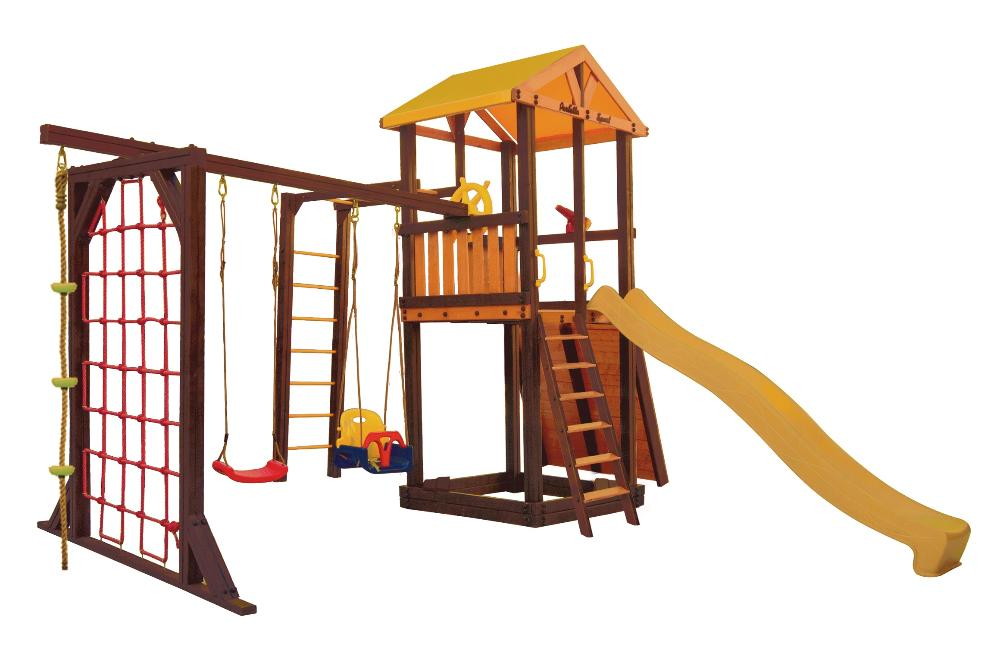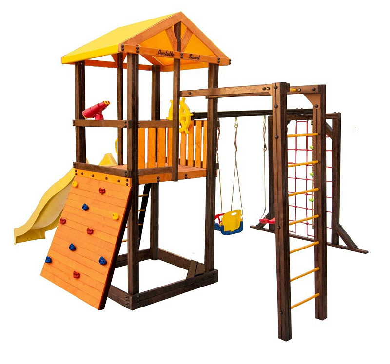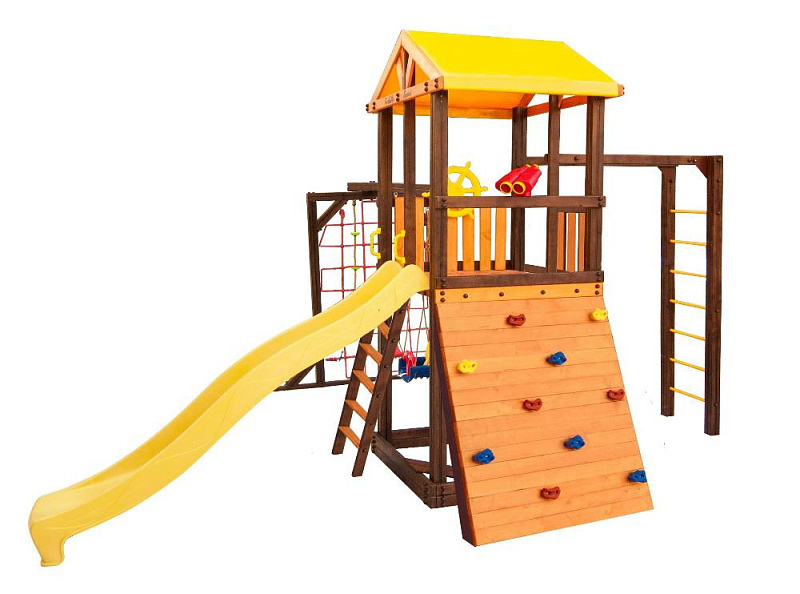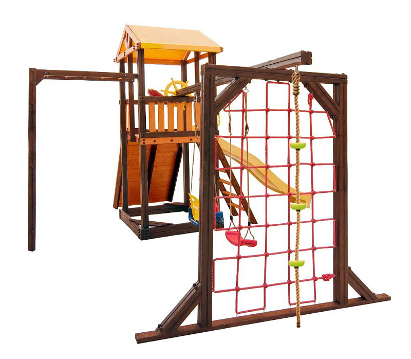 В набореигровой домик, песочница, лестница, скат, ручка пластиковая - 2 шт, Р-опция, П-опция, качели "Лодочка", качели "Малыш", канат с зацепами, штурвал "Шторм", бинокль "Капитан", скалодром большой