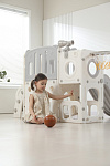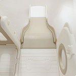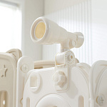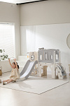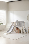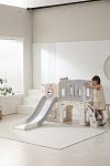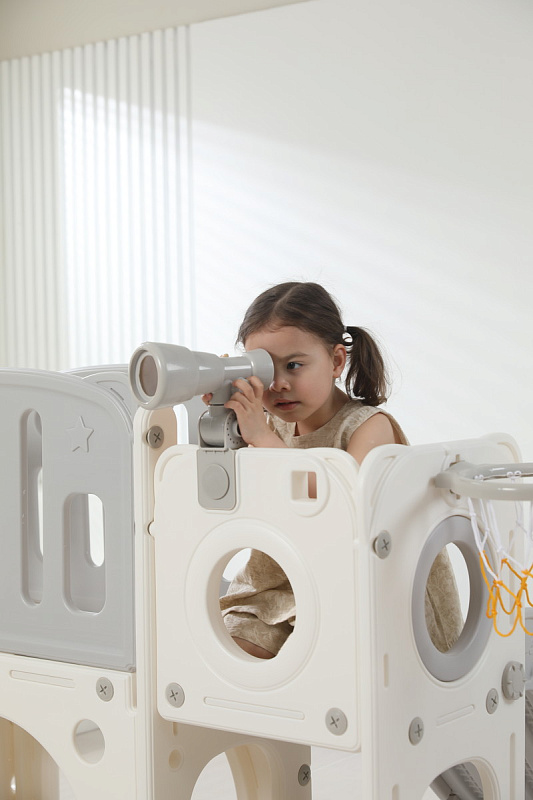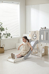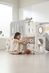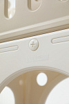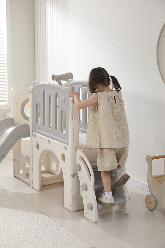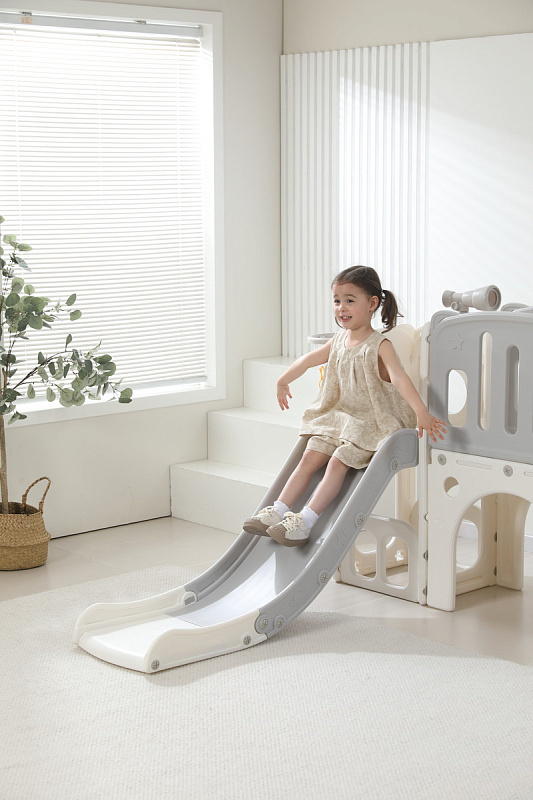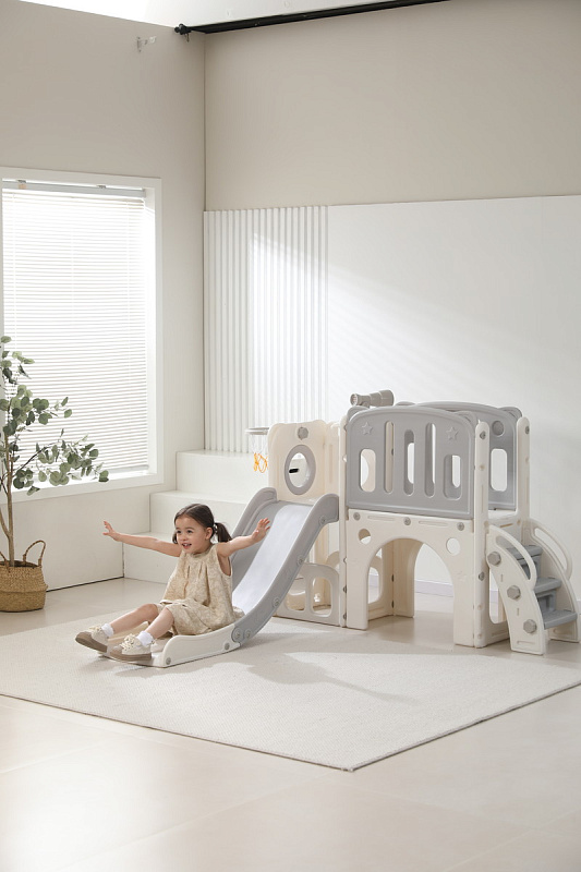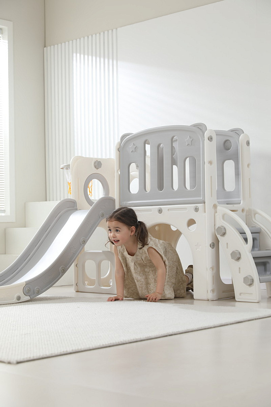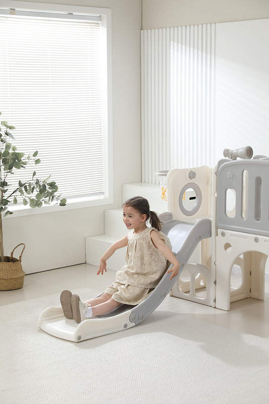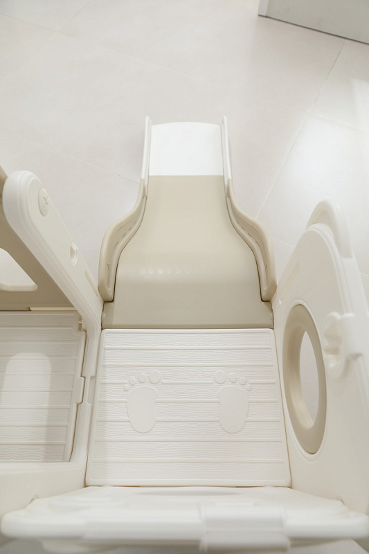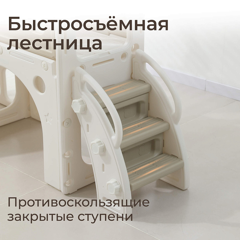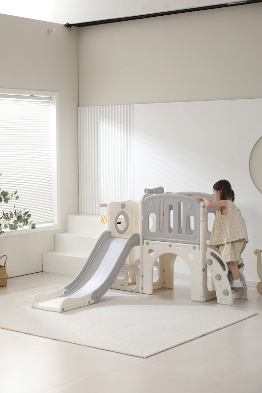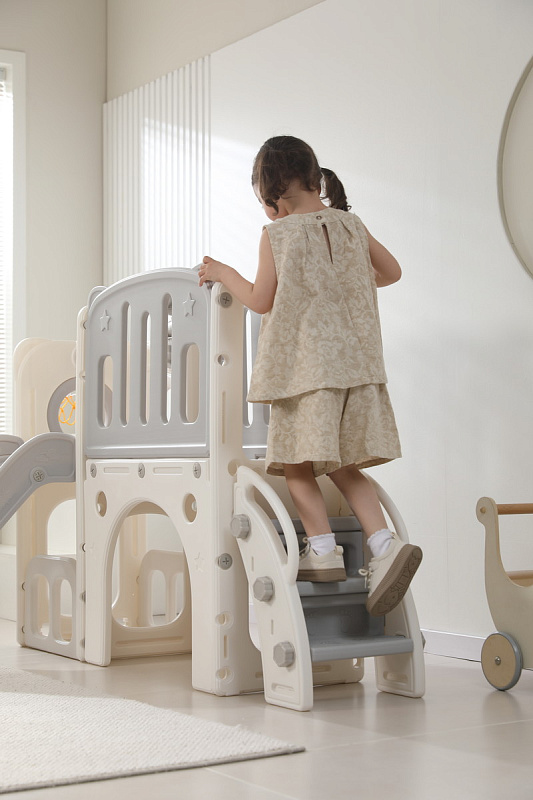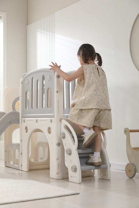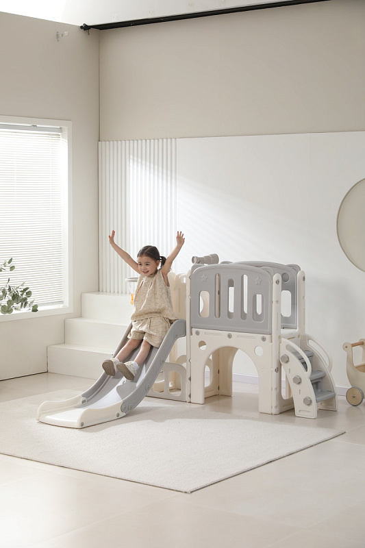 Детский комплекс выполнен в минималистичном дизайне с применением высококачественного пищевого пластика. Отсутствие выделяемых токсичных веществ, стойкость к воздействию ультрафиолета и полная гипоаллергенность материала обеспечивают безопасность и комфорт в процессе эксплуатации. Конструкция характеризуется эргономичными формами, включая сглаженные углы и покрытие, исключающее риск травмирования. Максимальная нагрузка на комплекс 70 кг.