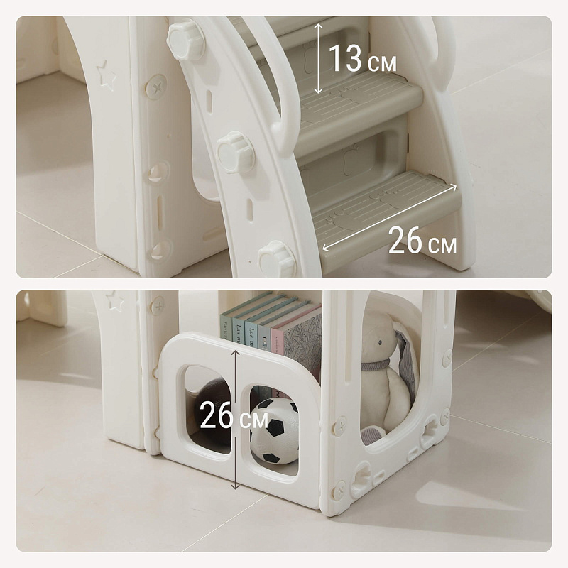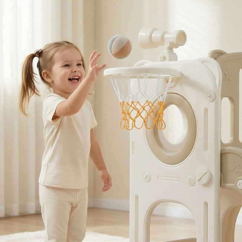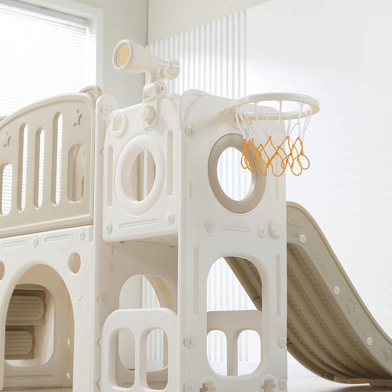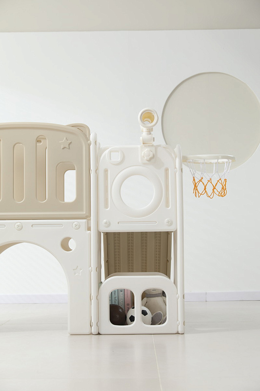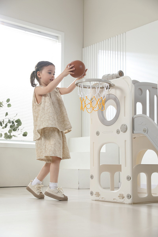 - Дополнительные аксессуары, такие как съемное баскетбольное кольцо диаметром 21 см, подвижный телескопический элемент и удобные отделения для хранения инвентаря.