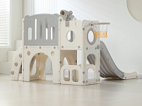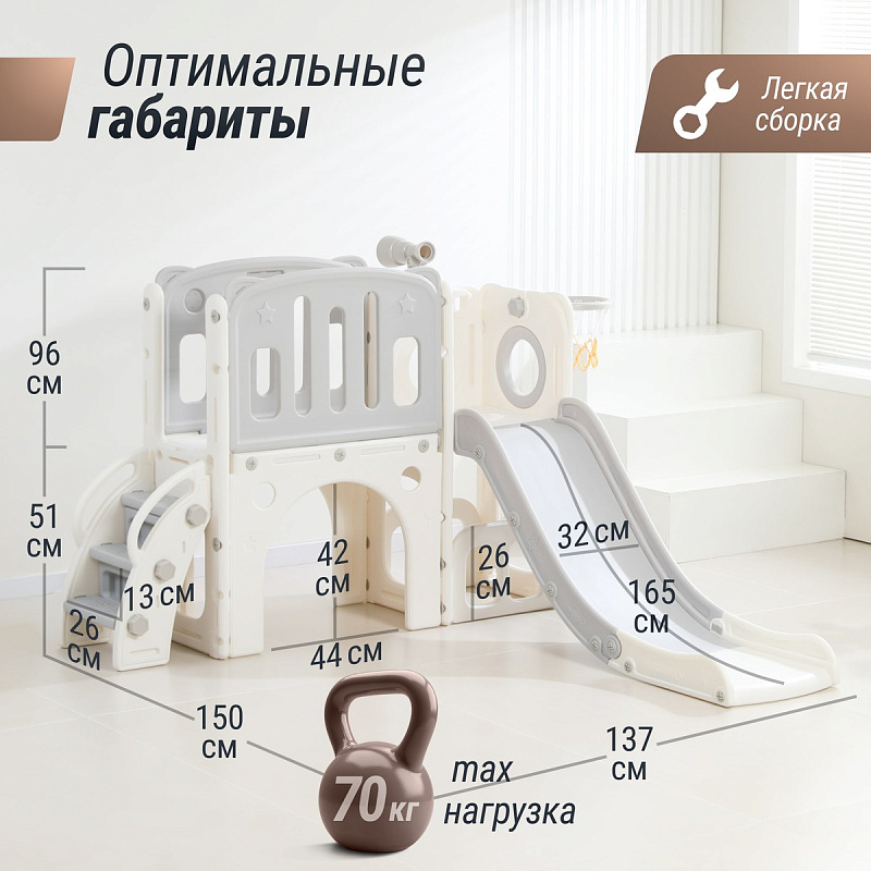 - Горку со спуском 165 см с гладкими поверхностями и противоскользящими ступенями, обеспечивающими безопасность при активном отдыхе;