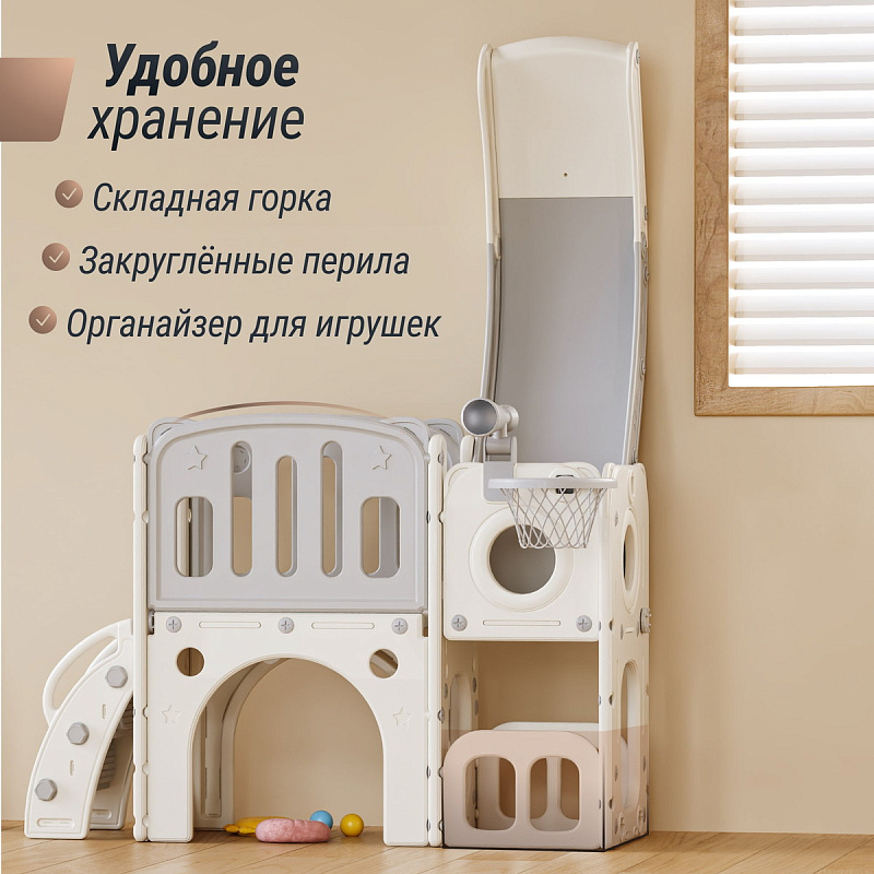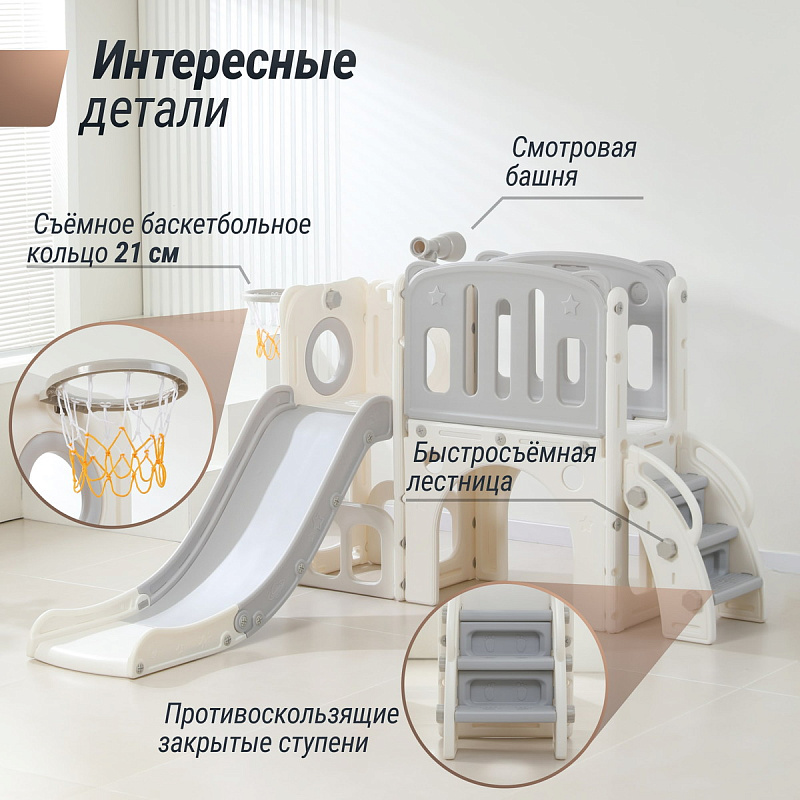 - Дополнительные аксессуары, такие как съемное баскетбольное кольцо диаметром 21 см, подвижный телескопический элемент и удобные отделения для хранения инвентаря.