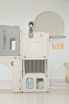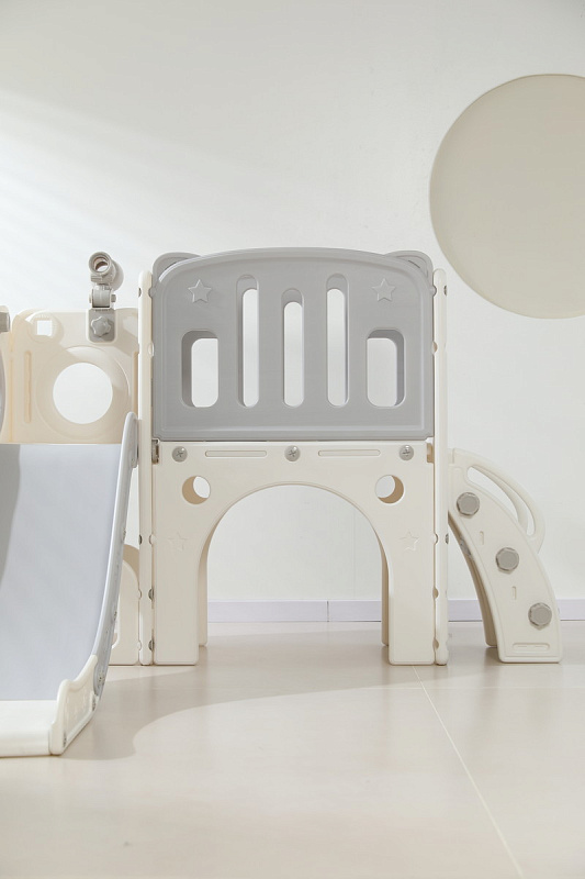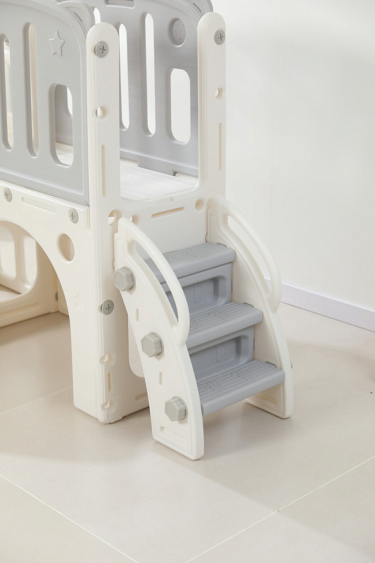 Детский комплекс выполнен в минималистичном дизайне с применением высококачественного пищевого пластика. Отсутствие выделяемых токсичных веществ, стойкость к воздействию ультрафиолета и полная гипоаллергенность материала обеспечивают безопасность и комфорт в процессе эксплуатации. Конструкция характеризуется эргономичными формами, включая сглаженные углы и покрытие, исключающее риск травмирования. Максимальная нагрузка на комплекс 70 кг.