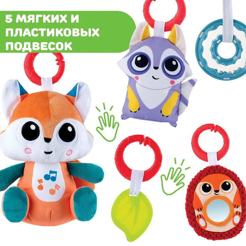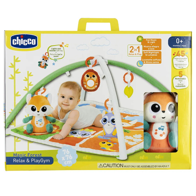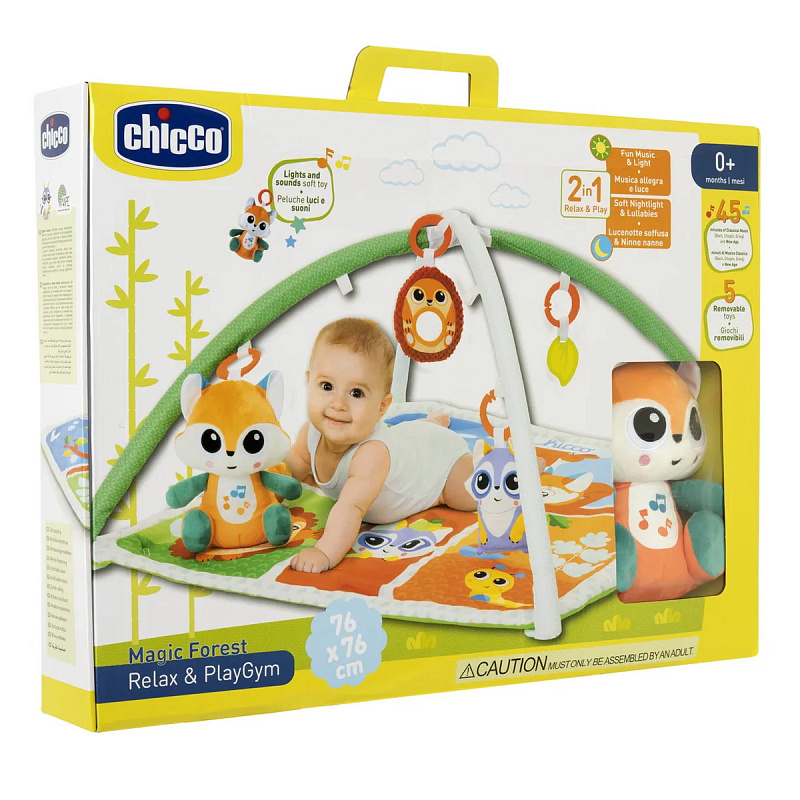 Мягкий развивающий коврик Волшебный лес 0+ с забавными игрушками перенесет малыша в сказочный мир Chicco. 5 съемных тканевых и пластиковых подвесок развлекут, развивая моторные, зрительные и слуховые навыки: Мягкий лисёнок: 45 минут музыки, ночник, регулируемый уровень громкости. Дневной и ночной режим. Мелодии Шопена и New Age. Животик игрушки светится. Енот: мягкая игрушка-подвеска. Ёжик: безопасное зеркальце для визуальных эффектов. Запускай первых солнечных зайчиков! Погремушка с удобной ручкой подойдет даже для самых маленьких. Листик-прорезыватель для первых зубов крохи. Большое пространство для игры 76х76 см, съёмные дуги. Подходит для машинной стирки (без дуг и подвесок). Электронные функции работают от 2 батареек ААА 1,5В (не в комплекте).