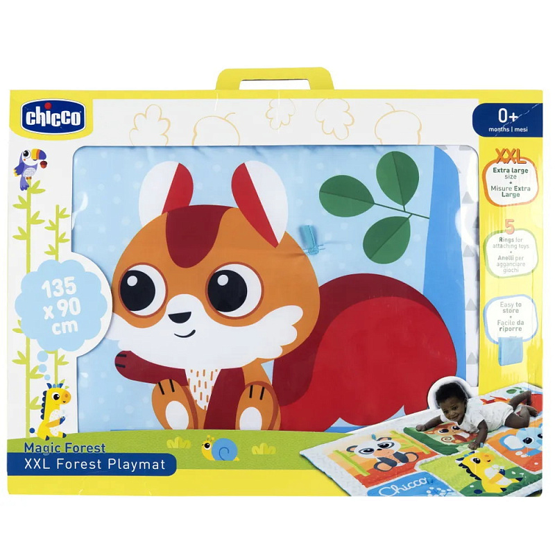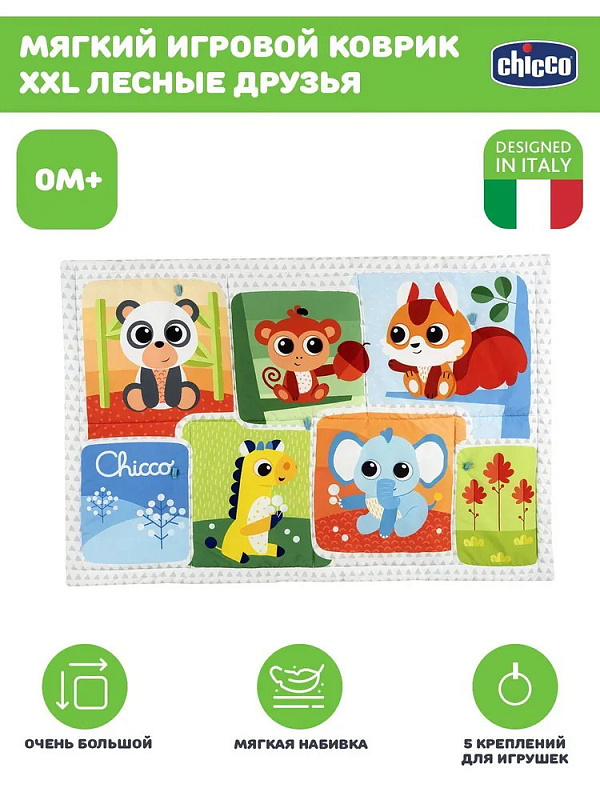 Игровой коврик мягконабивной XXL Лесные друзья Chicco 00011352000000. Детский мягкий игровой коврик Chicco Лесные друзья предназначен для веселых игр. Большое пространство 135 х 90 см и мягкая набивка сделают коврик любимым местом для игр. Благодаря 2 тесемкам удобно сложить и хранить, занимает мало места в сложенном виде. 5 колец для крепления различных игрушек (игрушки не входят в комплект). Можно стирать в стиральной машине.