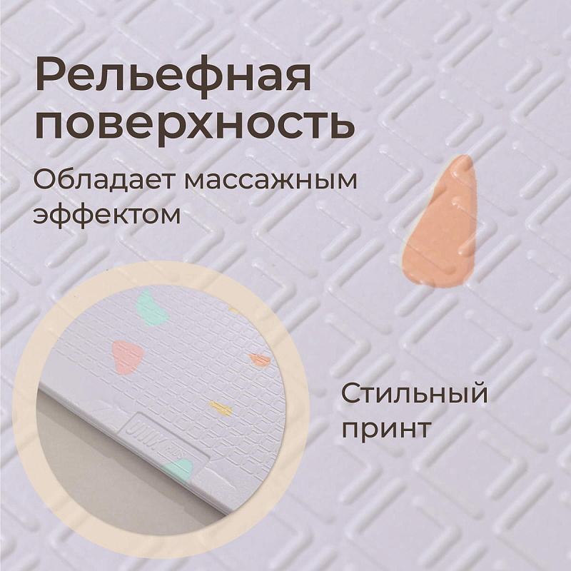 При создании изделий бренда UNIX Kids особое внимание уделяется качеству материалов и уровню комфорта. Коврик для новорожденного изготовлен из экологически чистого вспененного полиуретана толщиной 10 мм, идеально подходящего для первых шагов ребенка. Рельефная текстура обеспечивает дополнительную защиту от скольжения, обеспечивая надежную поддержку и устойчивость. Теперь вам не придется беспокоиться о случайных падениях или ушибах, ведь поверхность прекрасно амортизирует удары и смягчает падения. Даже на прохладных поверхностях ваш ребенок будет чувствовать себя тепло и уютно, так как термоковрик сохраняет комфортную температуру и защищает ножки от холода.