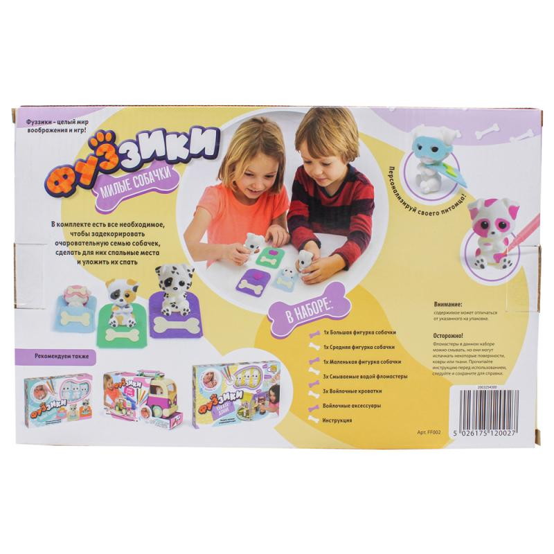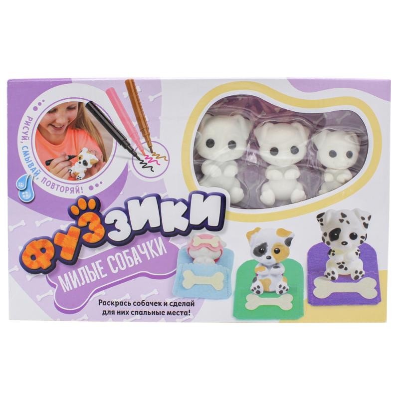 Фуззики - это милые питомцы, которых можно раскрашивать как тебе хочется! Фломастеры легко смываются водой, и ты можешь раскрашивать игрушки вновь и вновь, создавая каждый день новые образы для своего питомца. Игровой набор состоит из 3-х флокированных фигурок Собачек разного размера и 3-х войлочных комплектов для создания персональных спальных мешков для каждого питомца. Создай и задекорируй спальное место для питомца, чтобы уложить его спать. В наборе вы найдете смывающиеся водой фломастеры, чтобы украсить и персонализировать флокированного малыша, войлочные аксессуары для собачек. Фуззики. Целый мир воображения и игр!