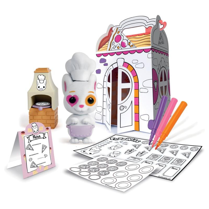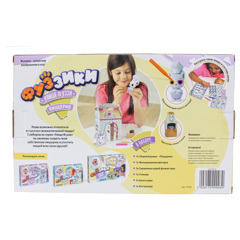 Фуззики - это милые питомцы, которых можно раскрашивать как тебе хочется! Фломастеры легко смываются водой, и ты можешь раскрашивать игрушки вновь и вновь, создавая каждый день новые образы для своего питомца. Игровой набор состоит из сборного домика Пиццерии и флокированной фигурки Мышки, которая является главном шеф-поваром пиццерии. У питомца есть все, что необходимо для приготовления настоящей пиццы: поварская шляпа и фартук, печь для пиццы и лопатка. В наборе вы найдете смывающиеся водой фломастеры, чтобы украсить и персонализировать флокированного малыша,множество аксессуаров, каждый из которых можно задекорировать на свой вкус и цвет.