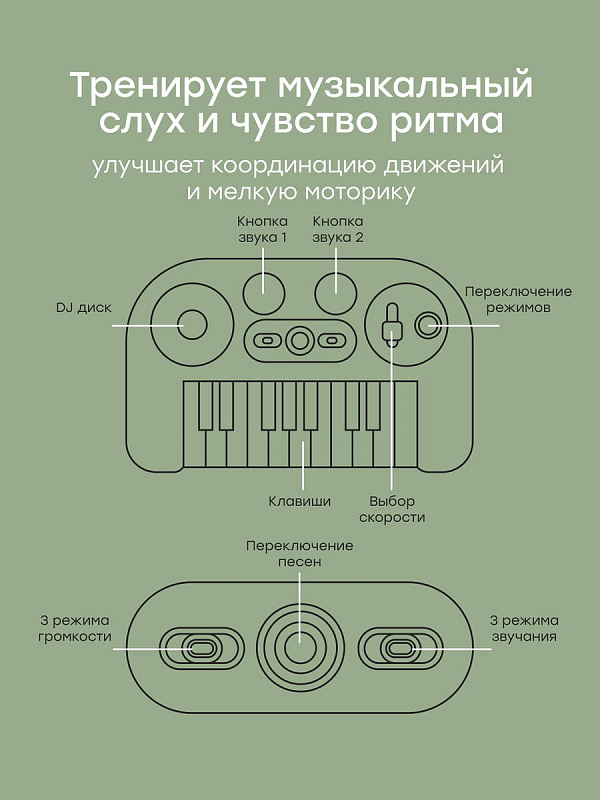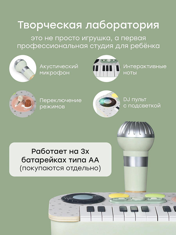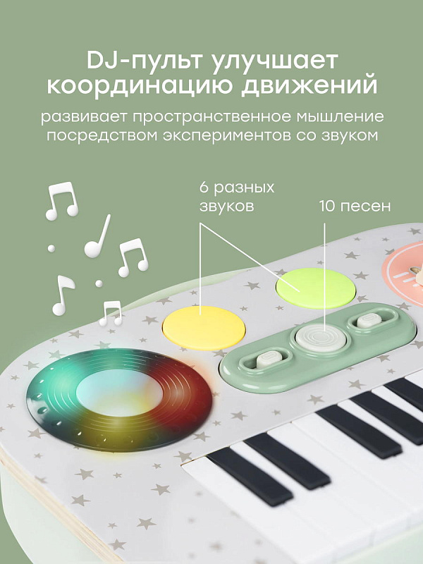 Музыкальный функционал - синтезатор детский сочетает простые DJ-элементы, микрофон детский и светомузыку, позволяя ребёнку пробовать себя в роли музыканта, певца и диджея