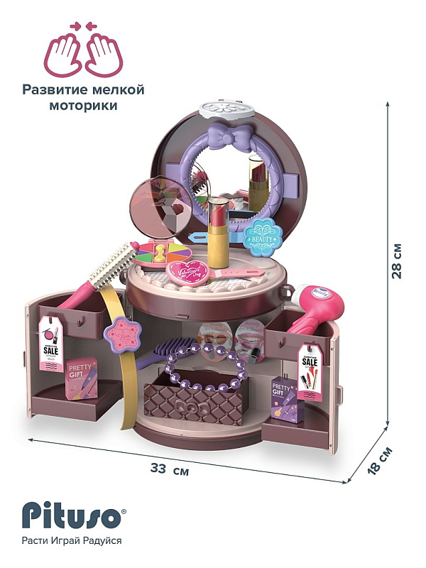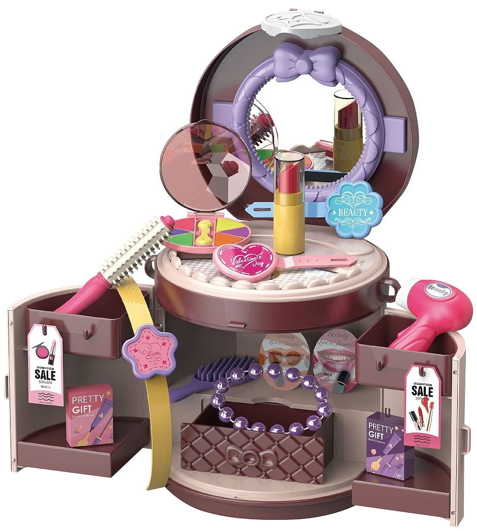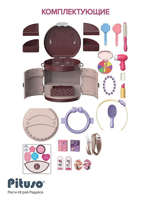 В комплекте: База (основа)-1 шт., зеркало (имитация)-1 шт, фен (имитация)-1 шт., расчестка-2шт.,ремешок-1 шт., украшения и элементы косметики - 14 шт.