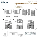 В комплект входят детали для сборки кухонной стойки, набор посуды, набор кухонных инструментов и приборов, набор фигурок-имитаций продуктов.