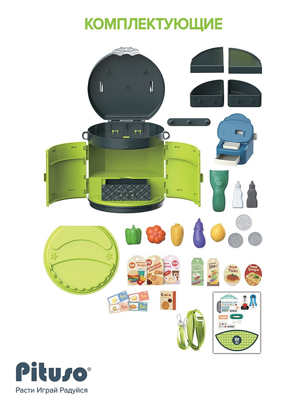 Комплектность: база (основа)-1 шт., касса - 1 шт, сканер (имитация)-1 шт., ремешок-1 шт., продукты и напитки-29 шт..
