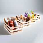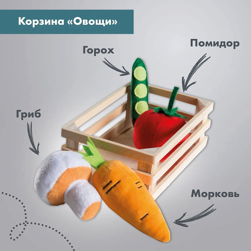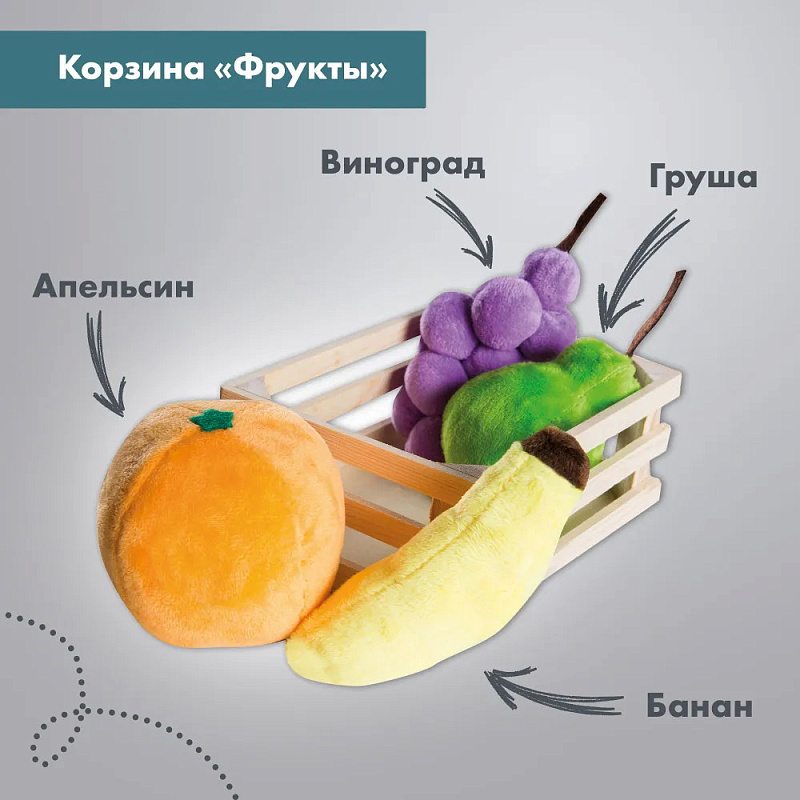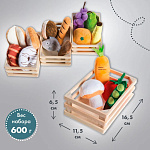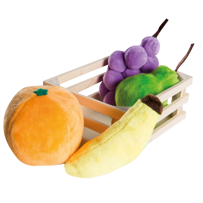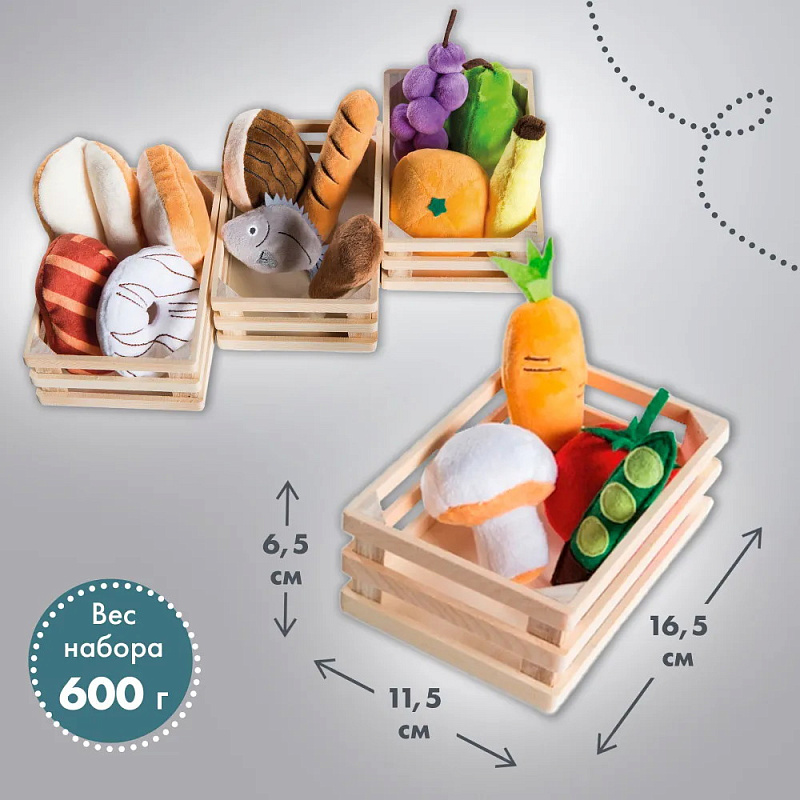 4 деревянные корзины содержат миниатюрные продукты из мягкого флиса в 4 различных группах продуктов: