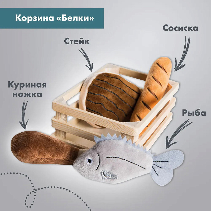 Корзина Белковая: стейк, колбаса, куриная ножка и рыба.